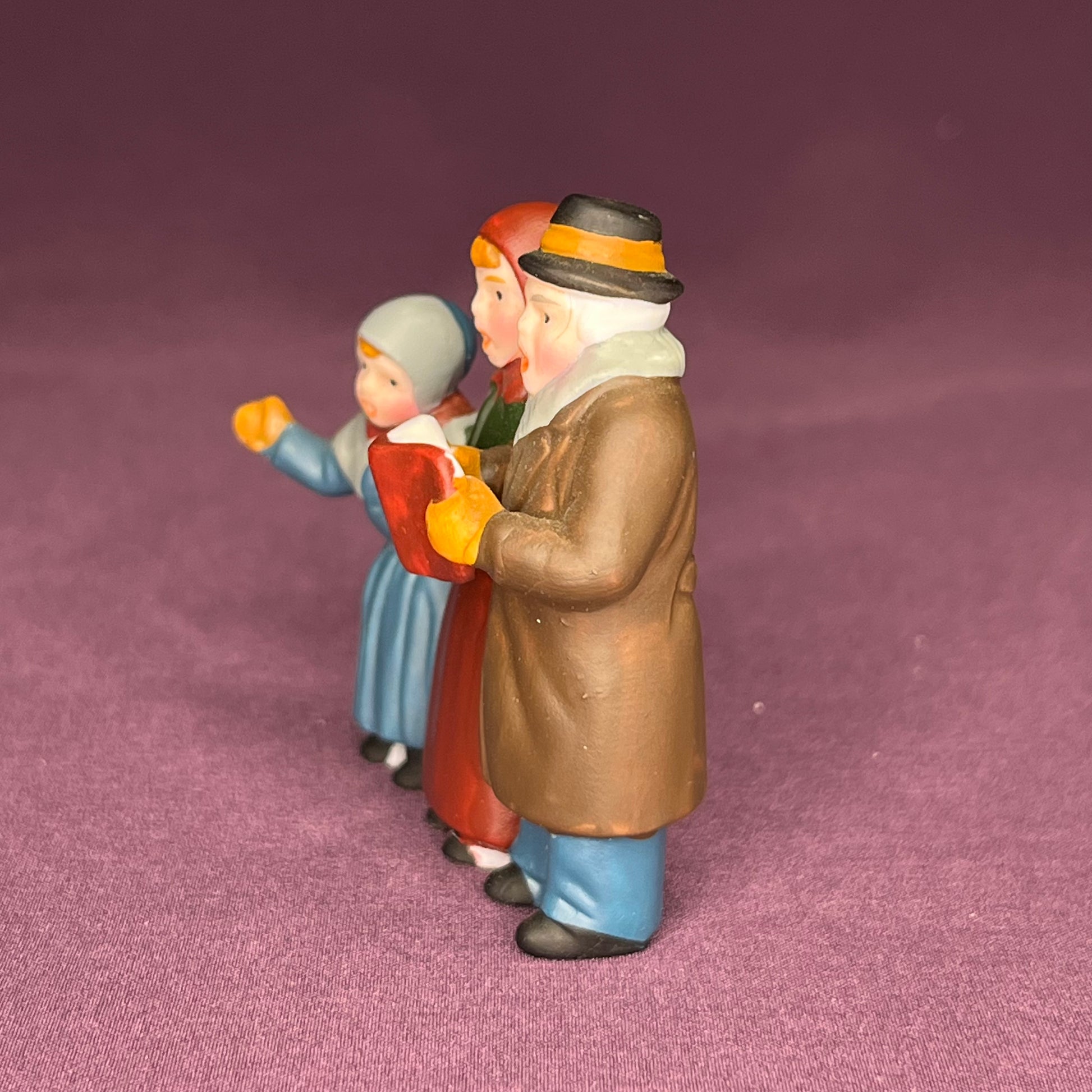 Carolers 3 piece accessory in the early black post version, vintage Department 56 Heritage Village Collection, #6526-9. Handpointed porcelain accessory in original box and packaging. Initially offered in 1984, retired in 1990.