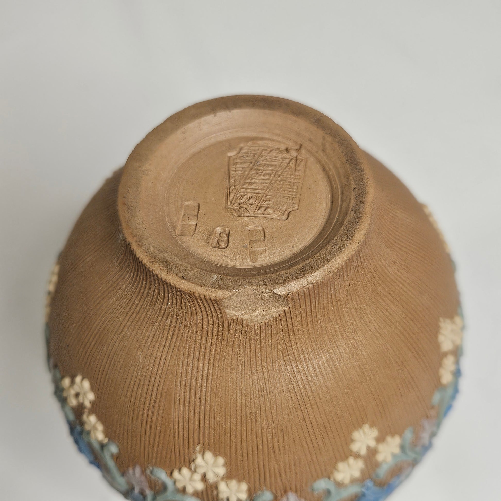 Doulton Lambeth Silicon Ware stoneware vase in chocolate brown with white and torquoise floral pattern. Bottom is marked Doulton Silicon Lambeth. This impressed mark was used from 1881 - 1912.