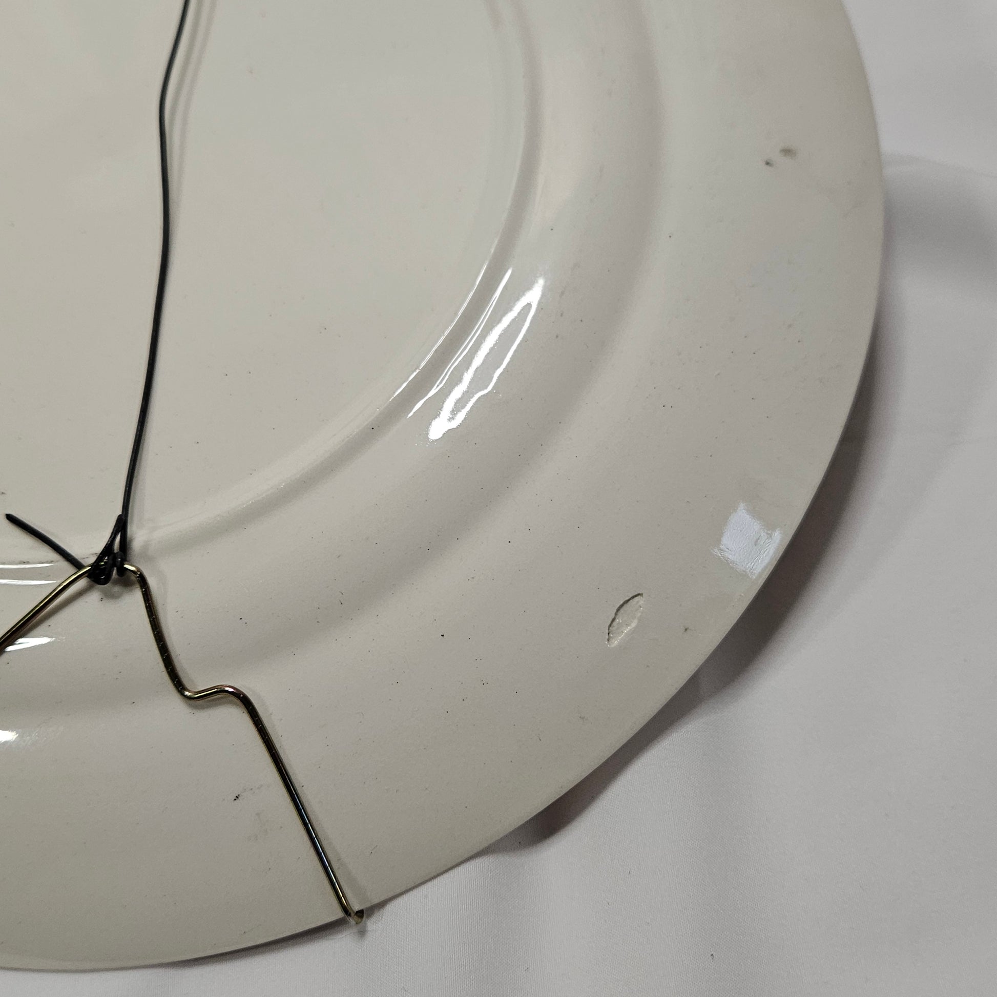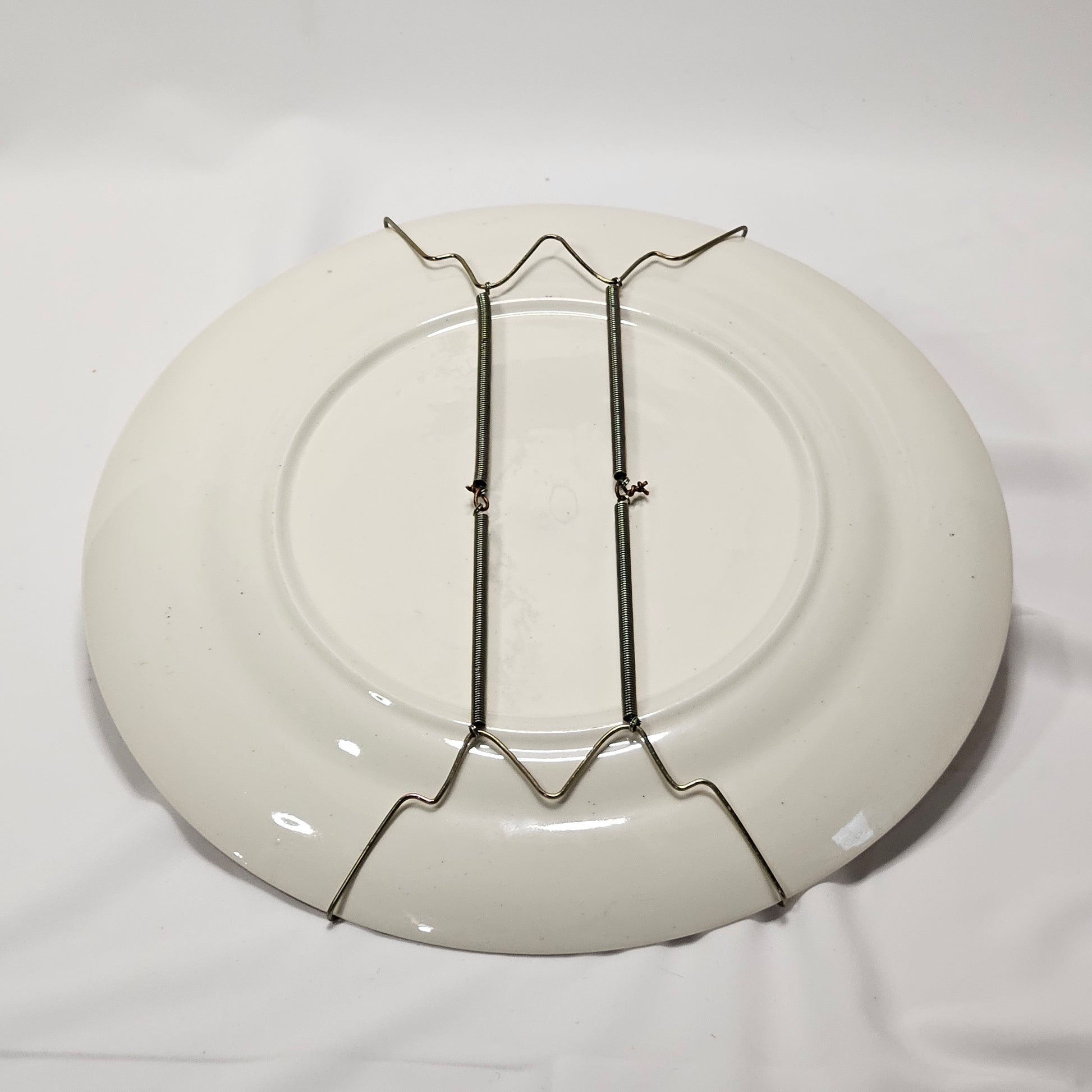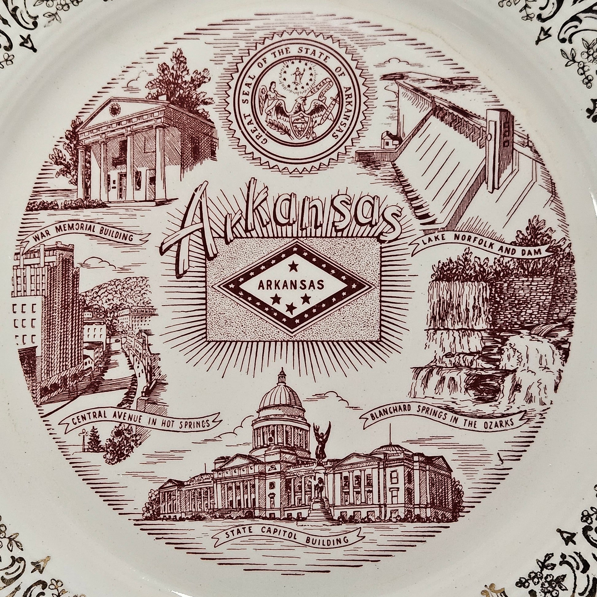 Arkansas State decorative plate with primitive hanger, red and gold, 10" diameter, minor imperfection on back - see photo for detail