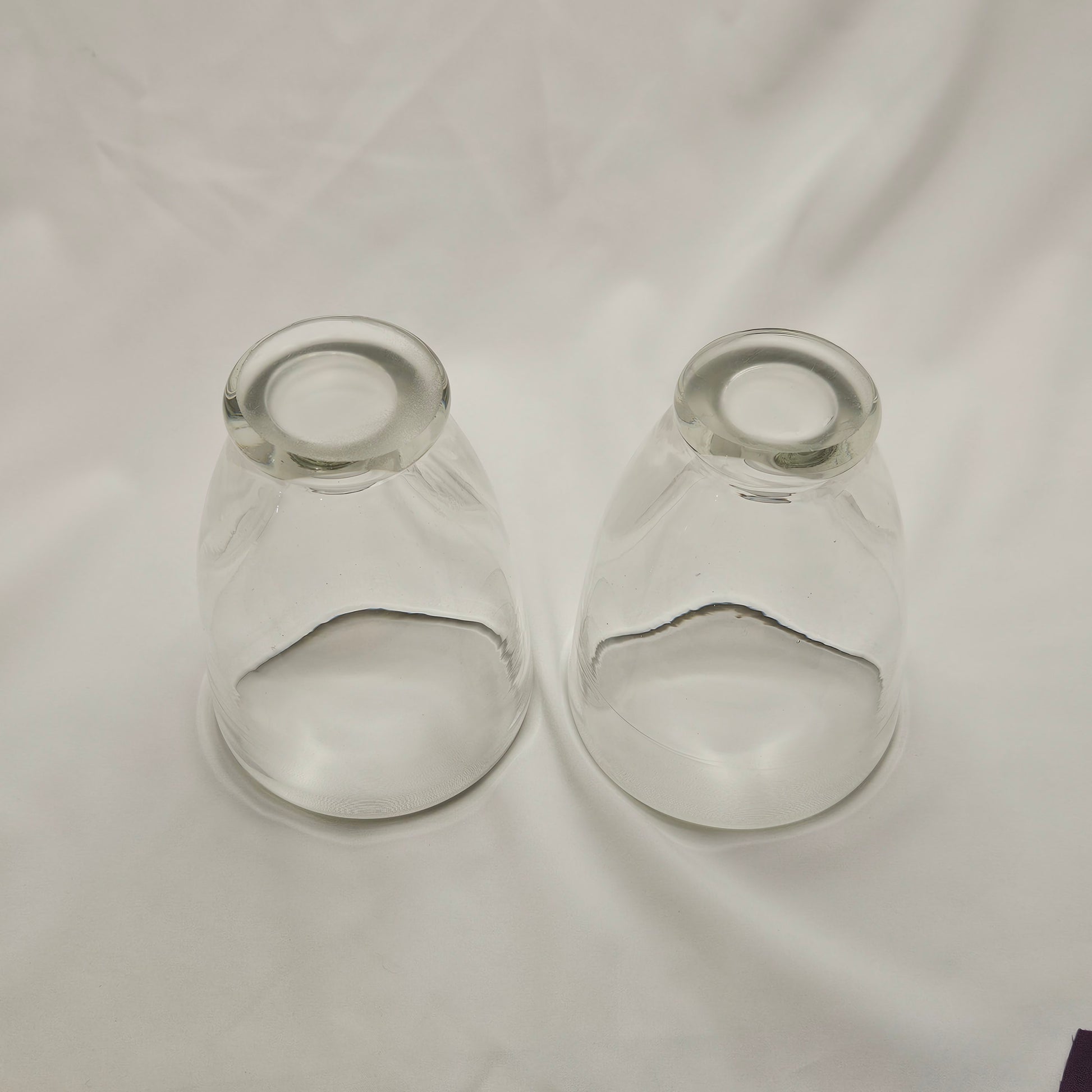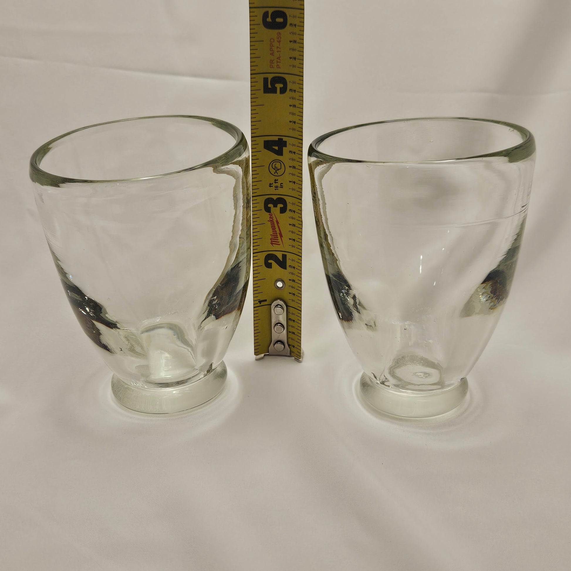 Vintage pair of hand-blown art glass tumbers are 4" tall. They are made of a beautiful, clear, heavy glass