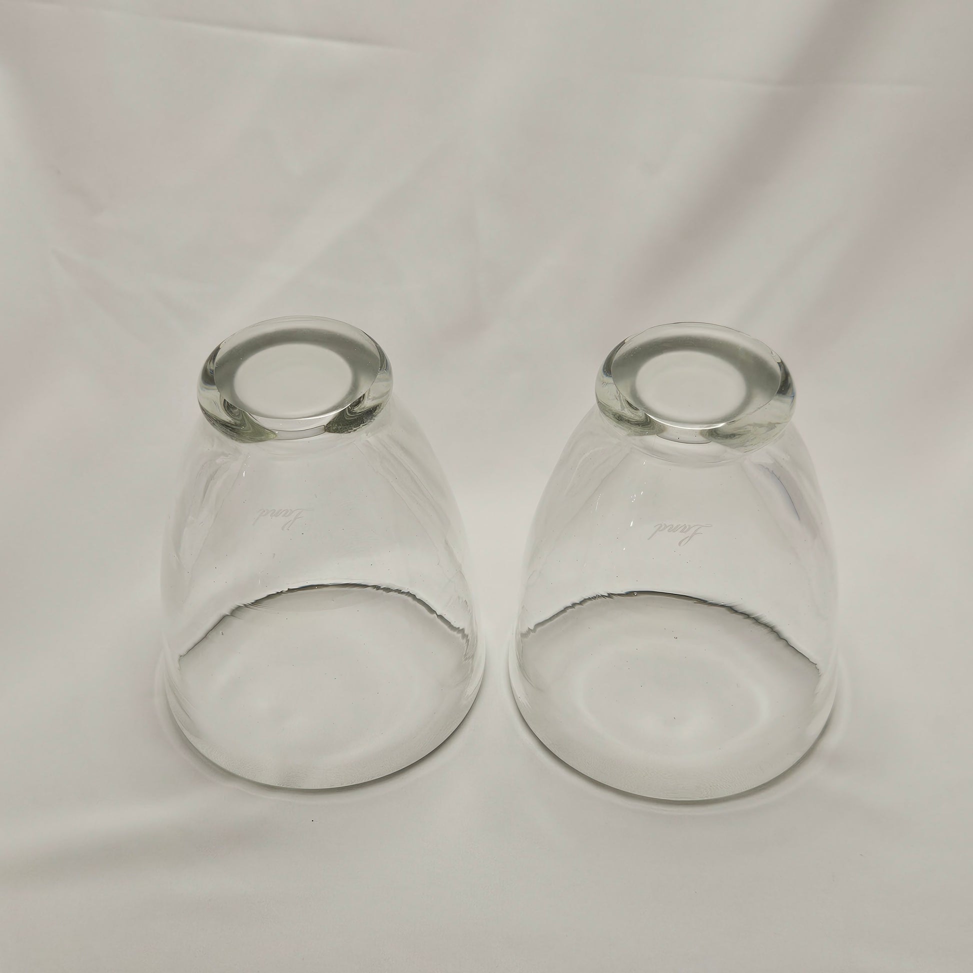 Vintage pair of hand-blown art glass tumbers are 4" tall. They are made of a beautiful, clear, heavy glass and are etched with the word "Land".