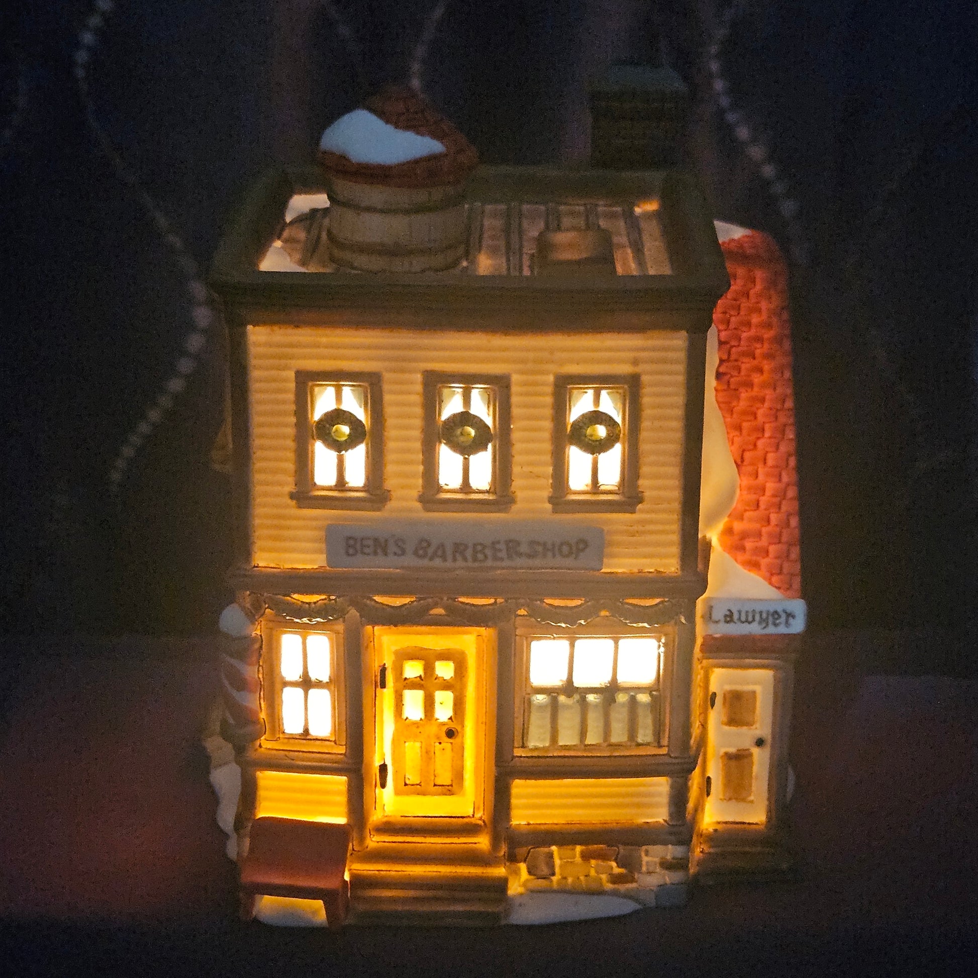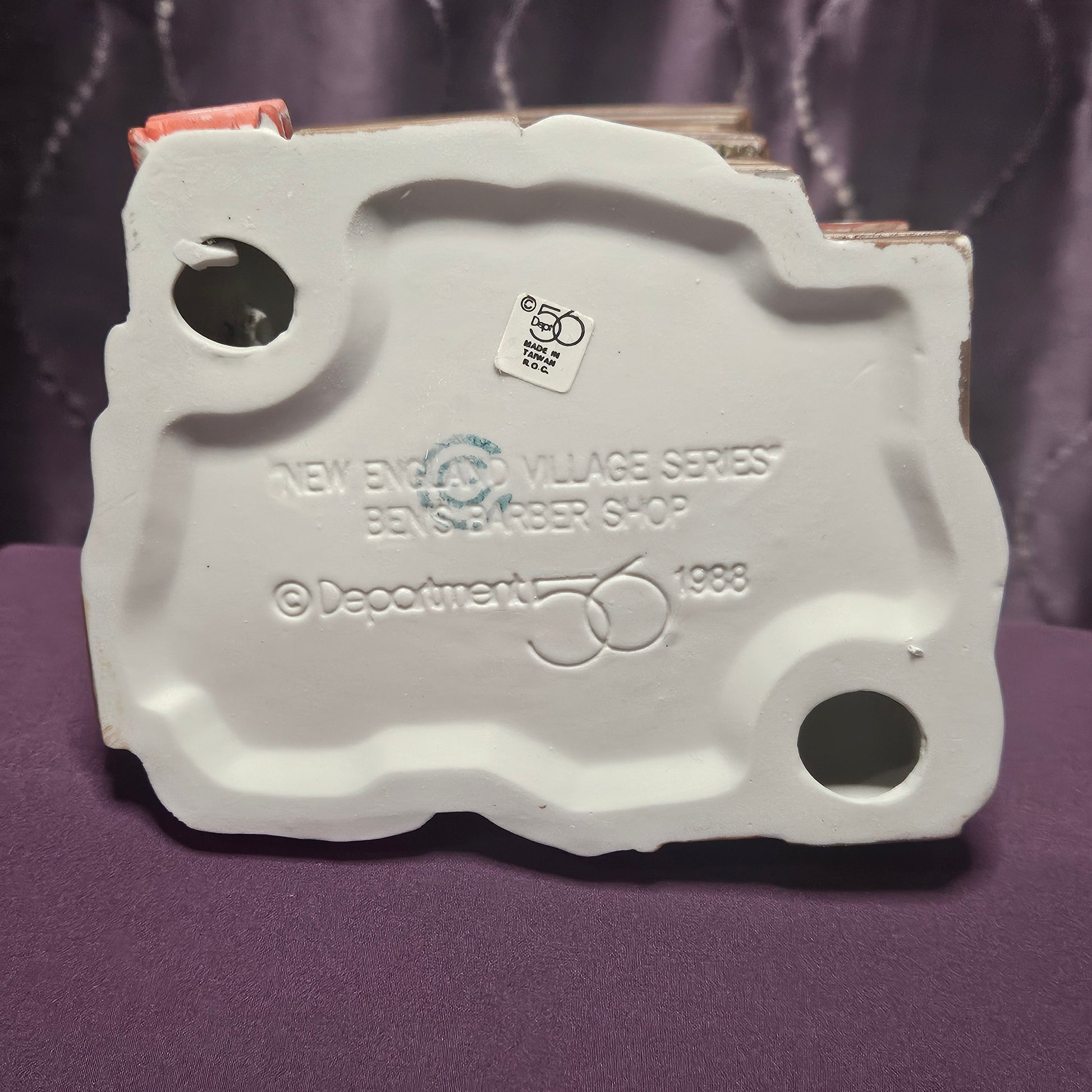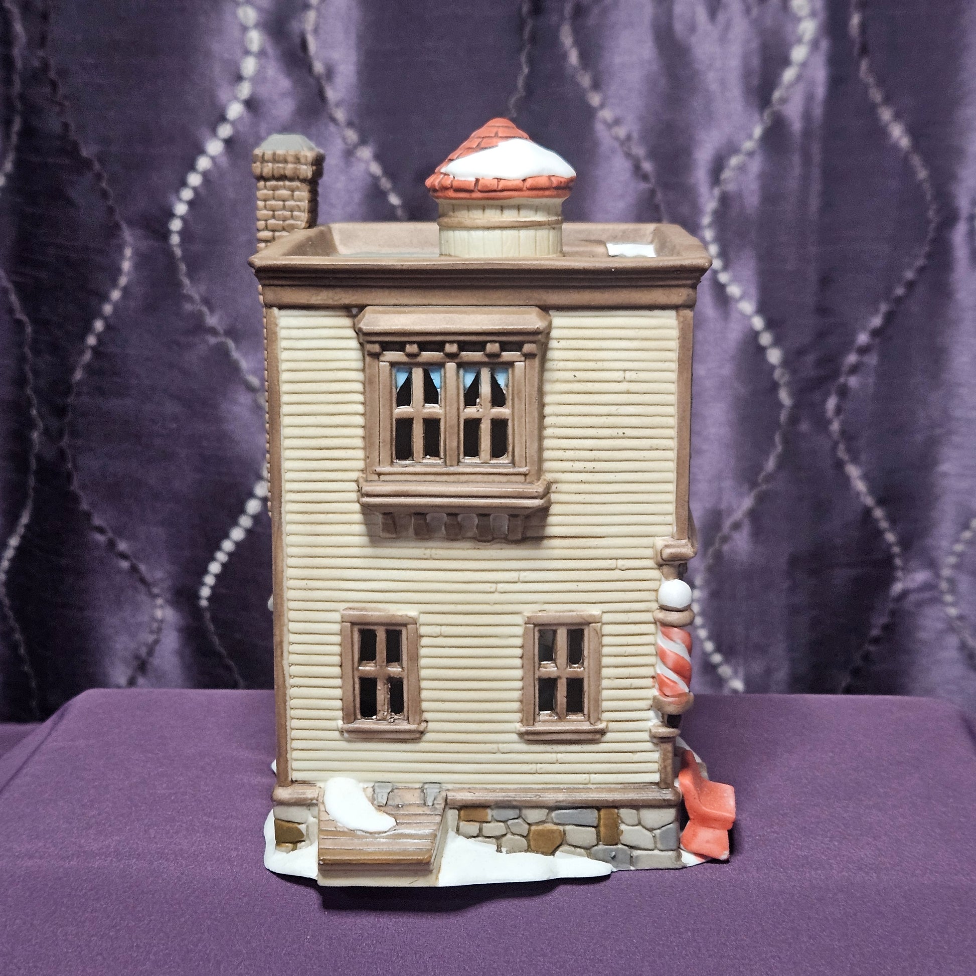 Ben's Barber Shop, Department 56 Heritage Village Collection, #5939-0. Vintage handpainted porcelain lighted house with original box and packaging. This house was first released in 1988 and retired in 1990.