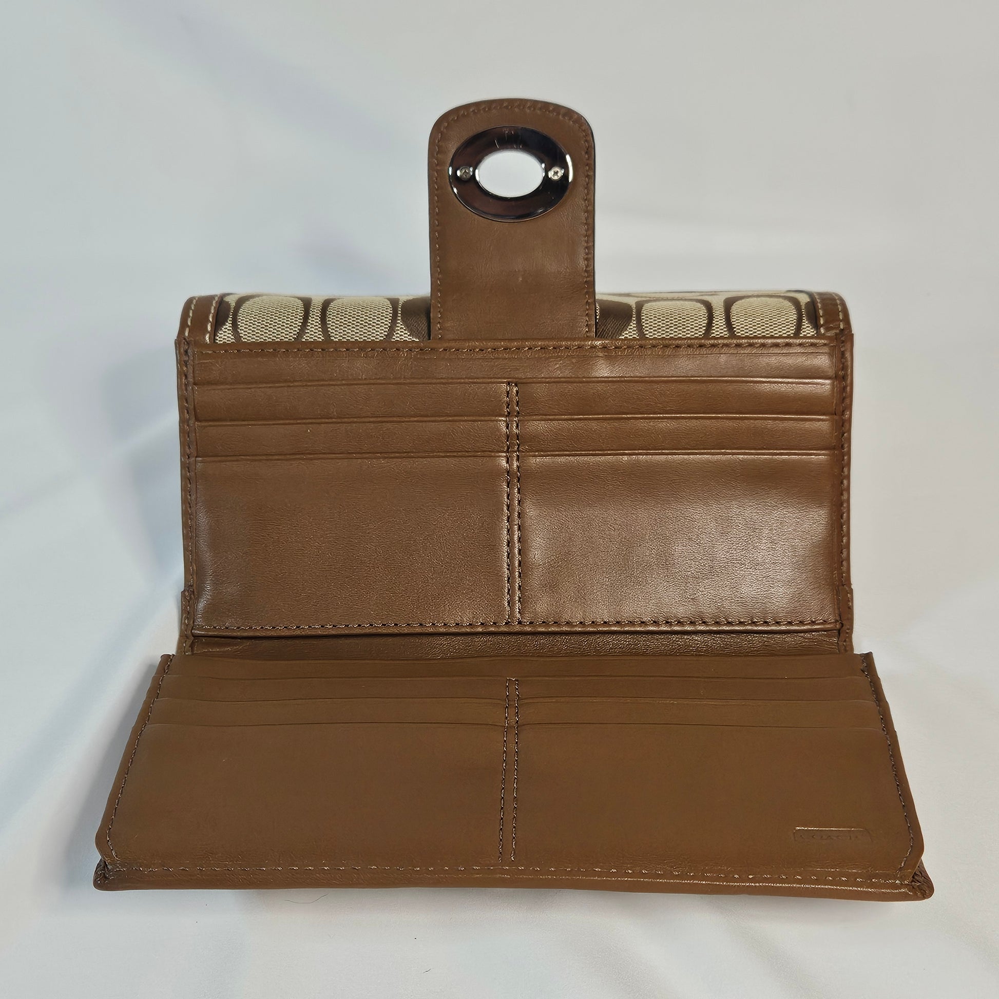 Coach Wallet, Signature C Khaki Brown, Turnlock, Jacquard Leather Trim, salmon colored interior. Excellent condition with no significant signs of use.