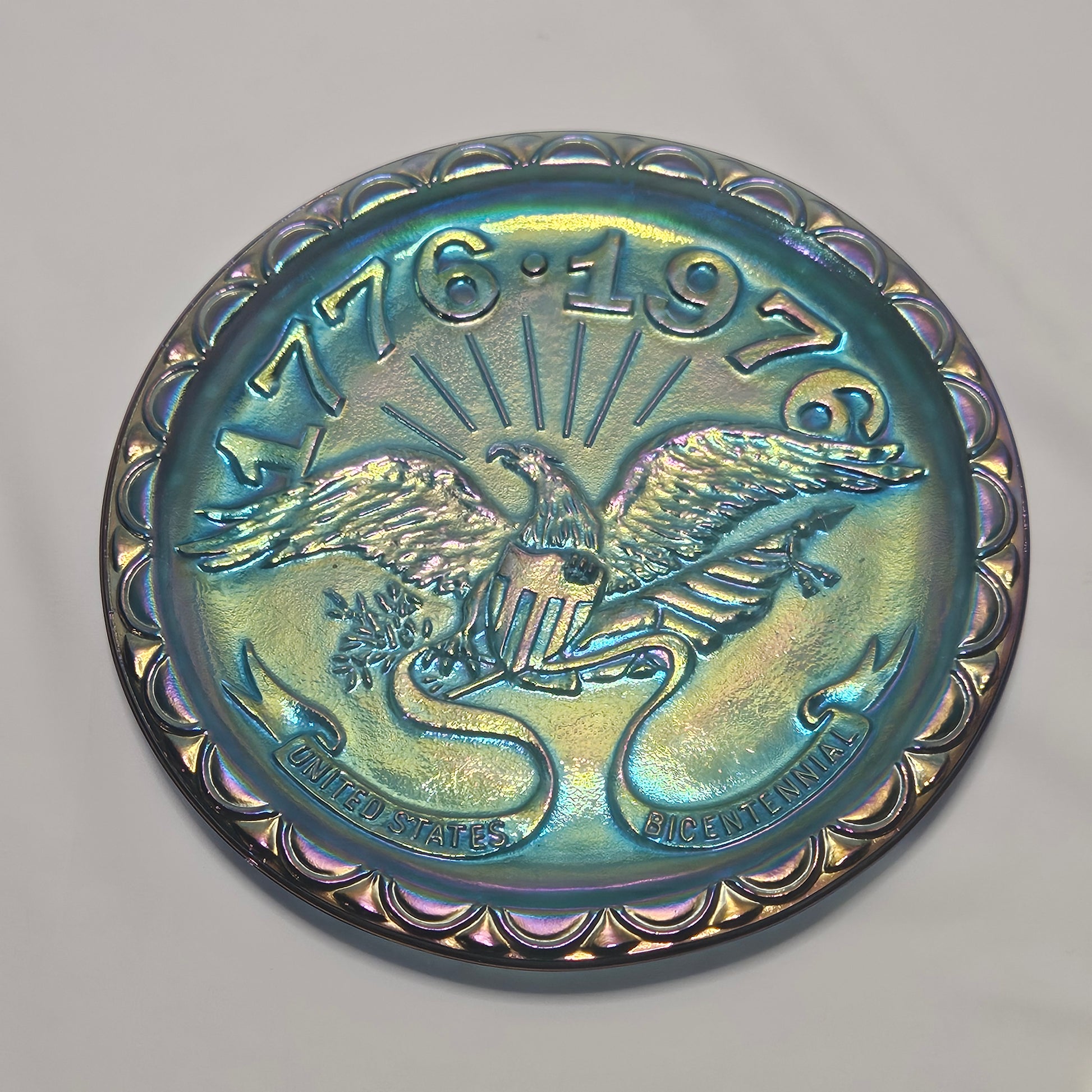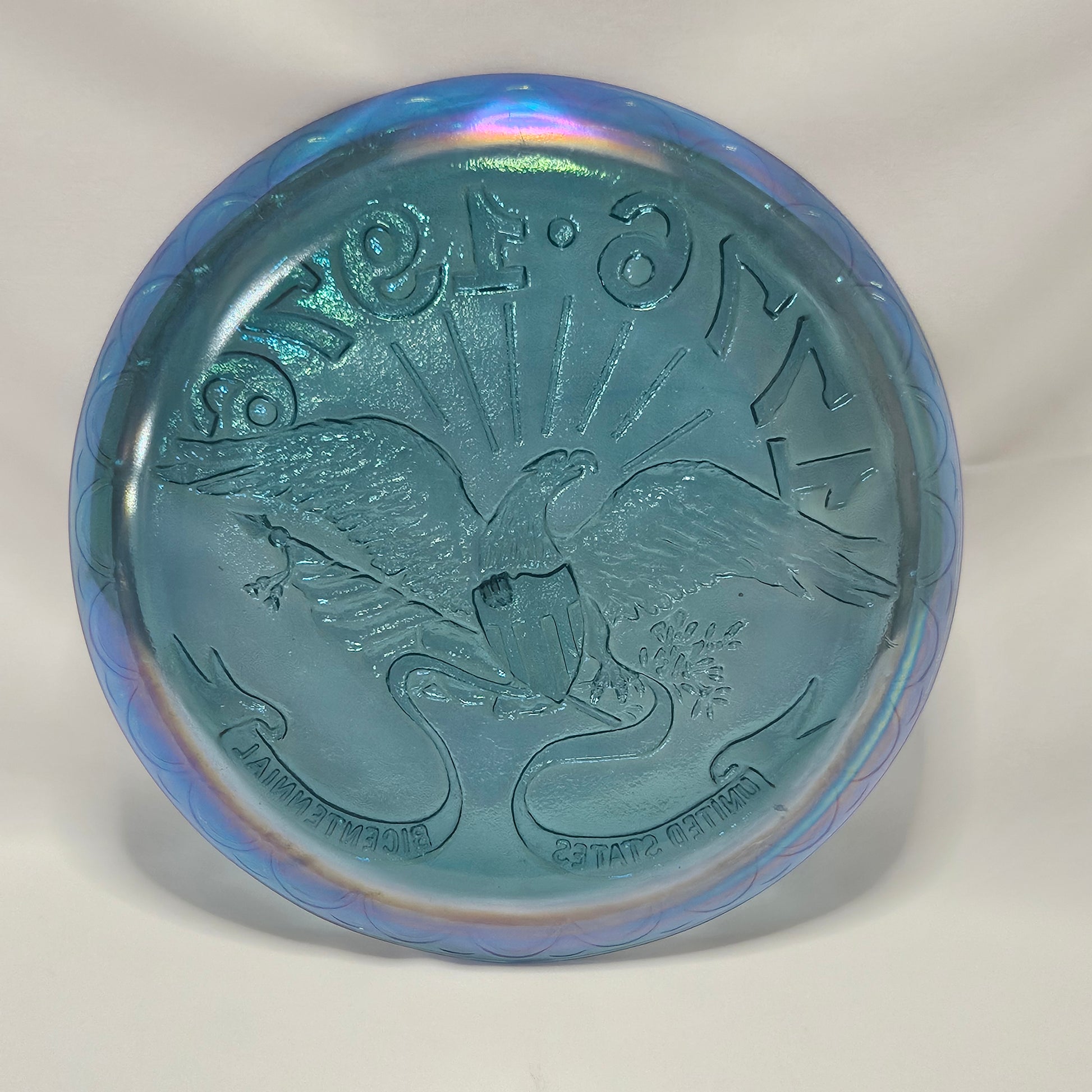 Bicentennial commemorative plate made by Indiana Glass in a beauthiful iridescent blue color. No visible cracks, chips or wear. Plate has an 8" diameter.