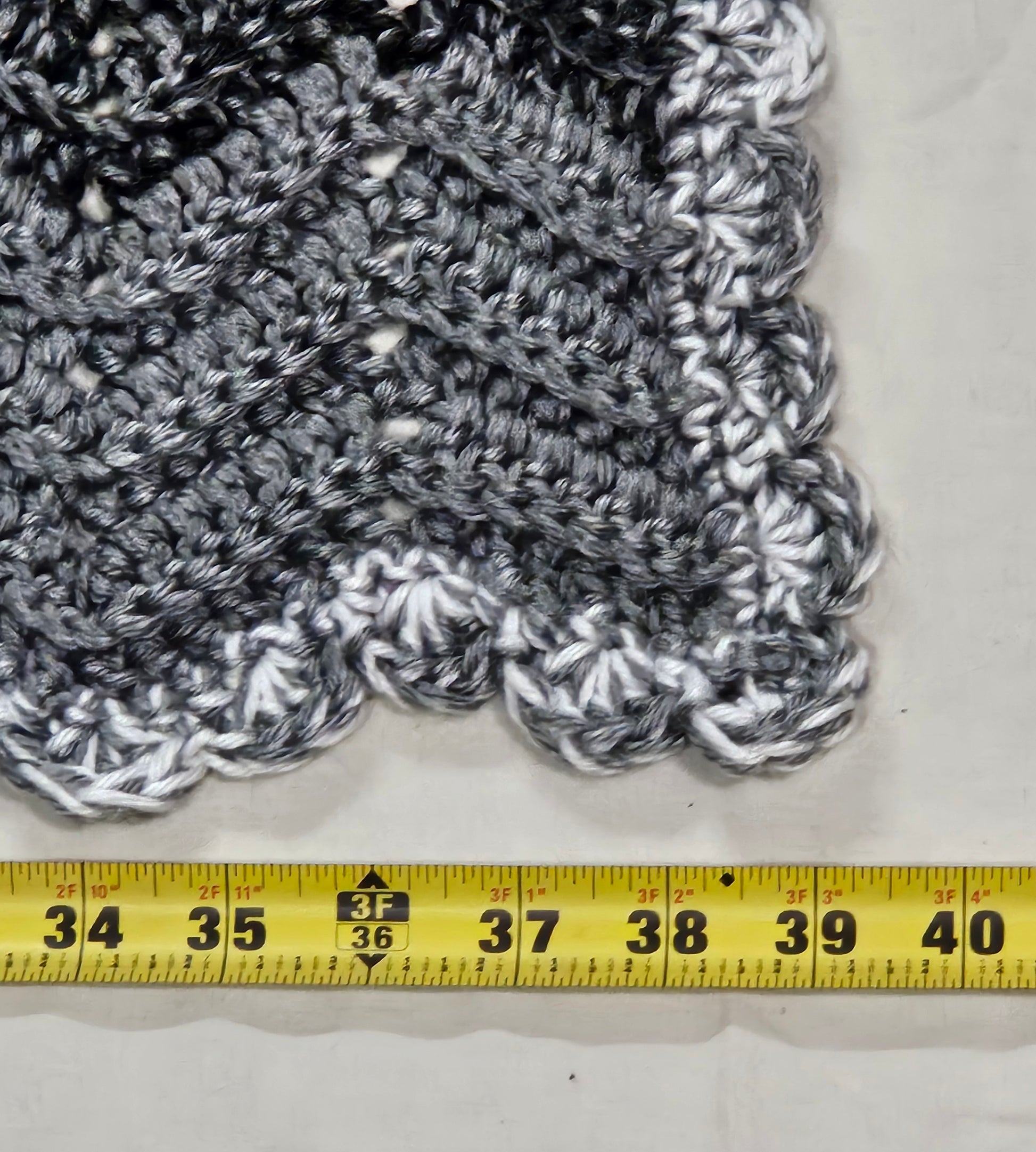 Handmade crochet heavy blanket in black, white, and grey, 45" x 39"