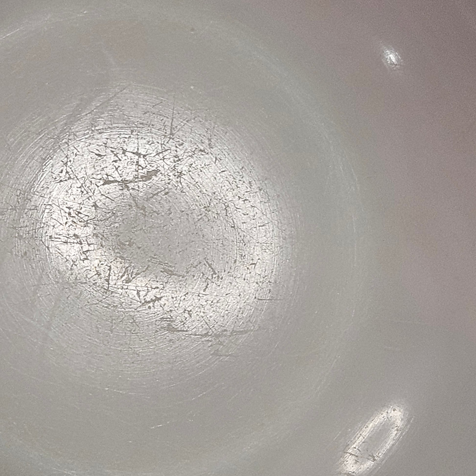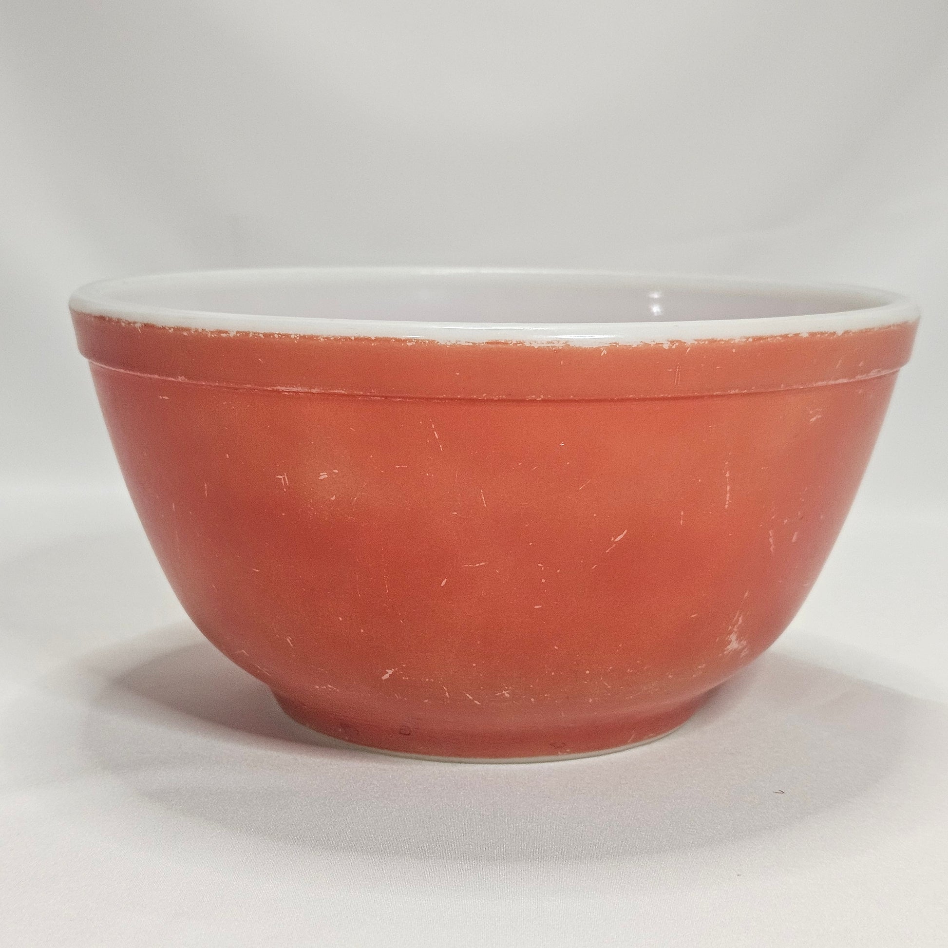 Early red pyrex bowl with TM REG USA stamp. Small blemishes on exterior and scratches on inside bottom of bowl that would be typical of use. Overall in great shape. Bowl has 7" diameter and is 3.75" tall.