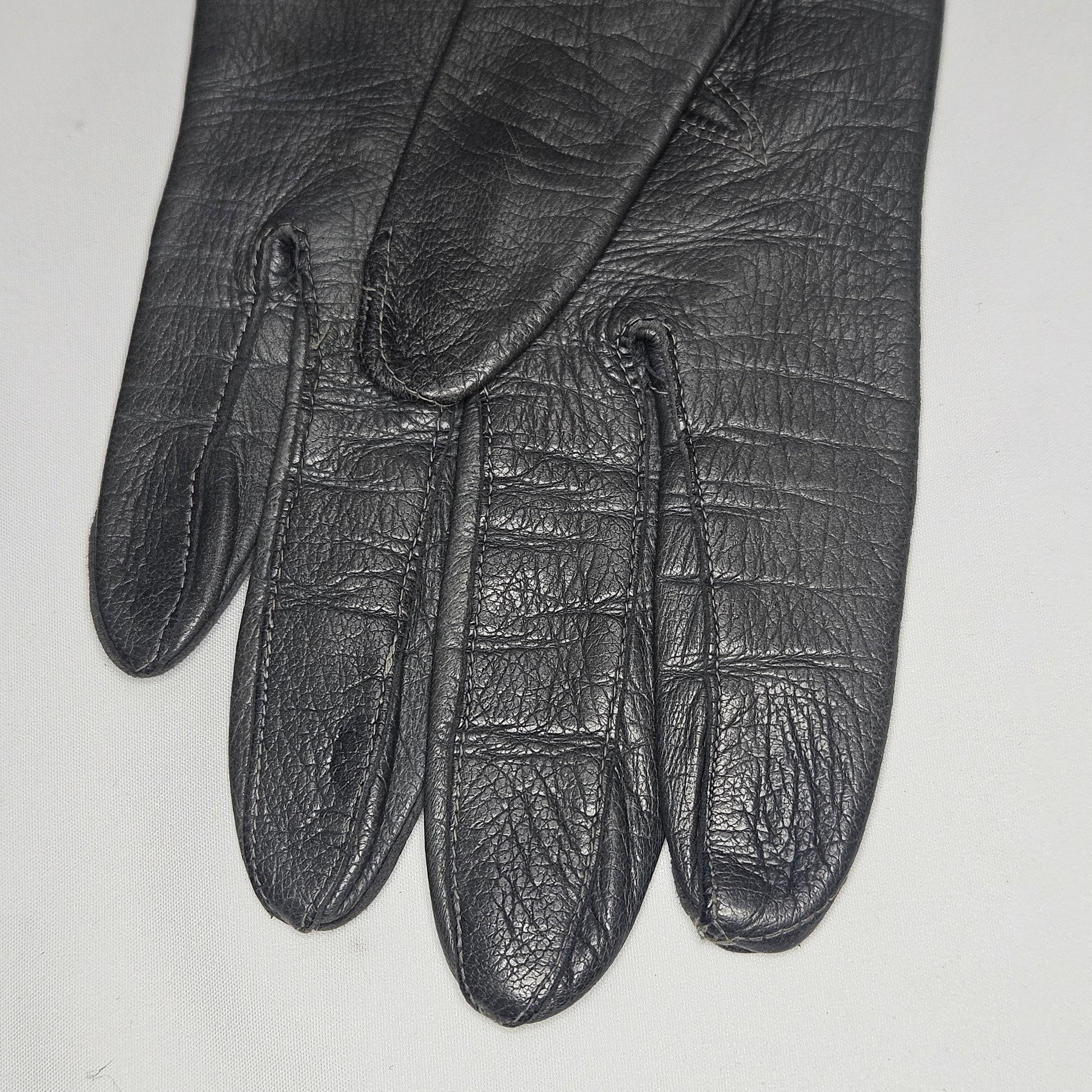 Good vintage condition. 3.25" wide at the knuckles, base of thumb to tip of middle finger is 6.5", write to tip of middle finger is 11". No size tags, but was found with a group of gloves that were all size 7.