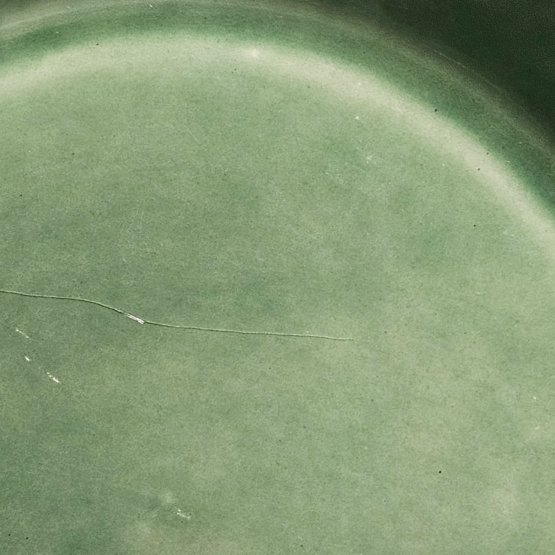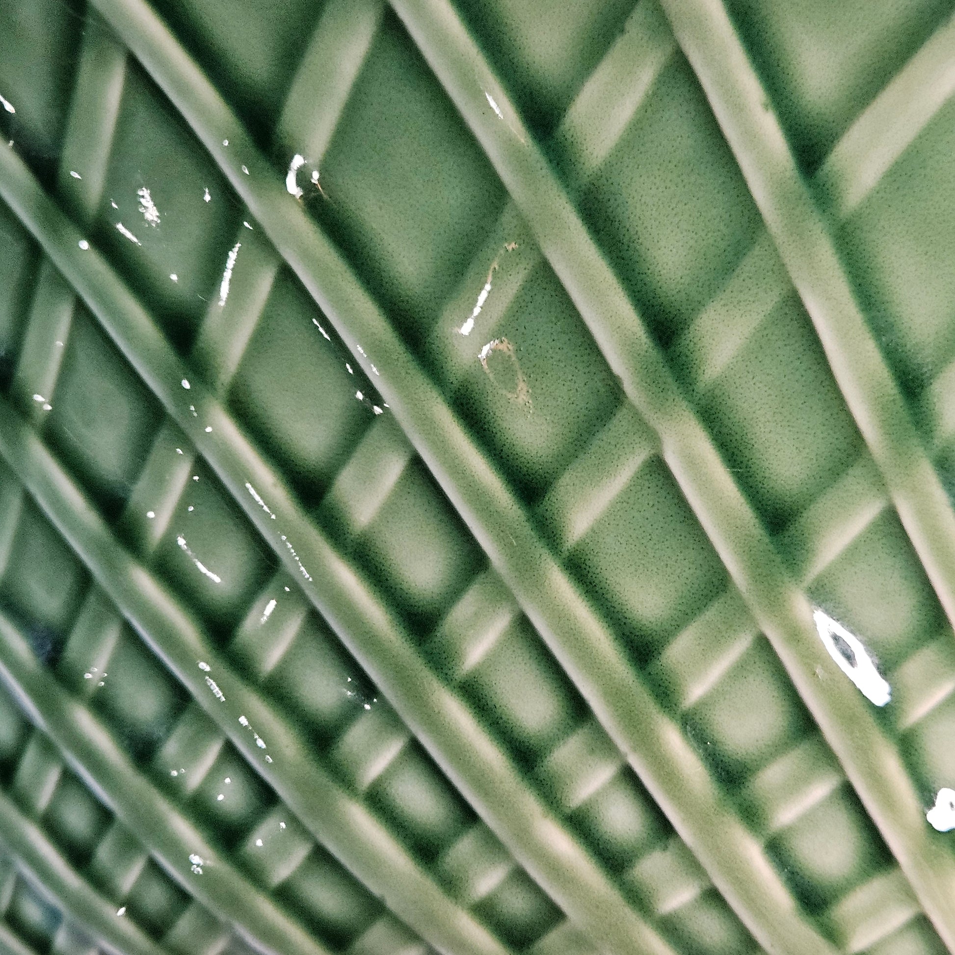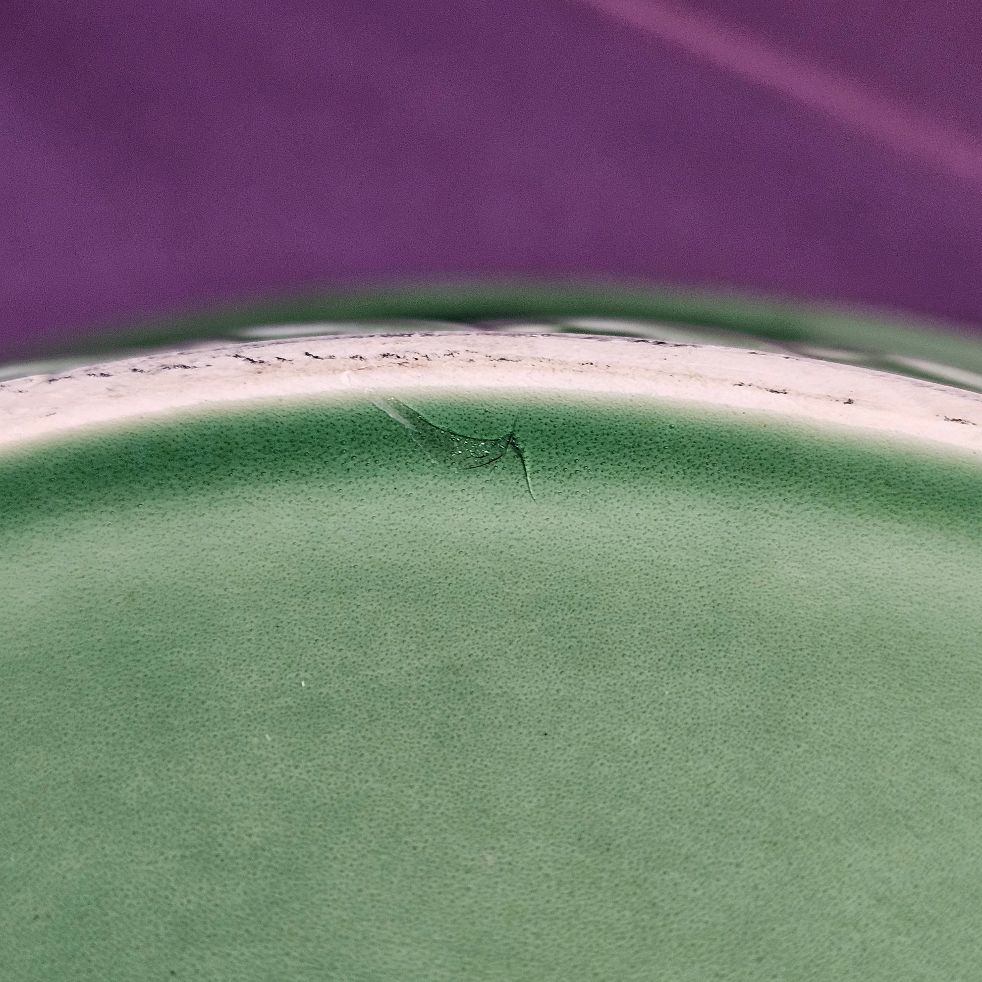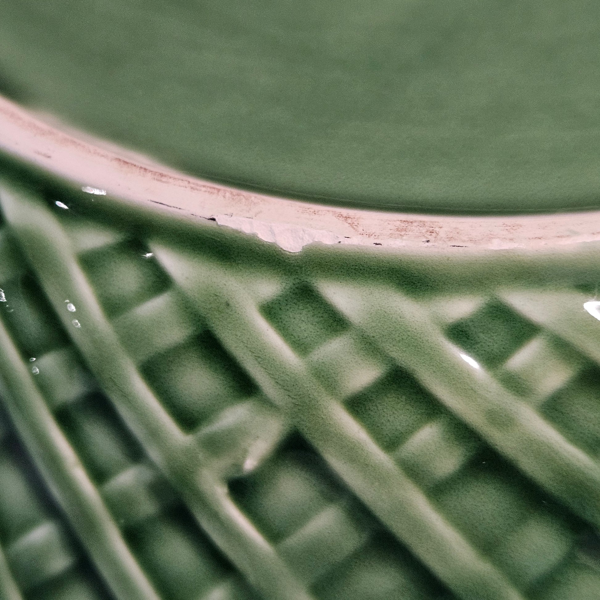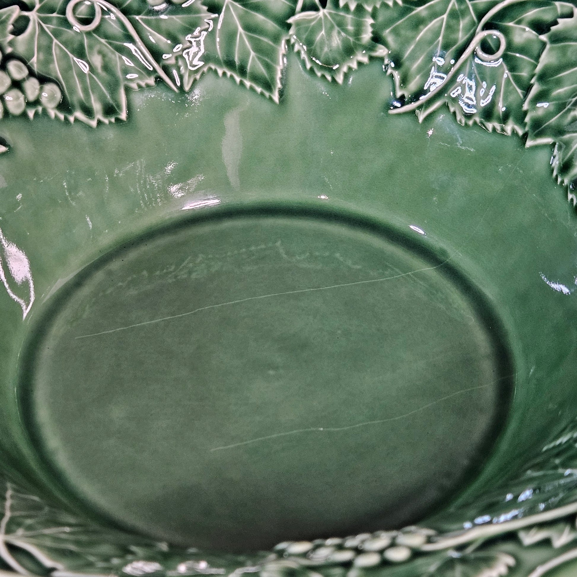 Vintage BORDALLO PINHEIRO Portugal - 13" Green Serving Bowl, Lattice with Grapevines, straight glaze cracks inside bowl and small imperfections - see photos for details