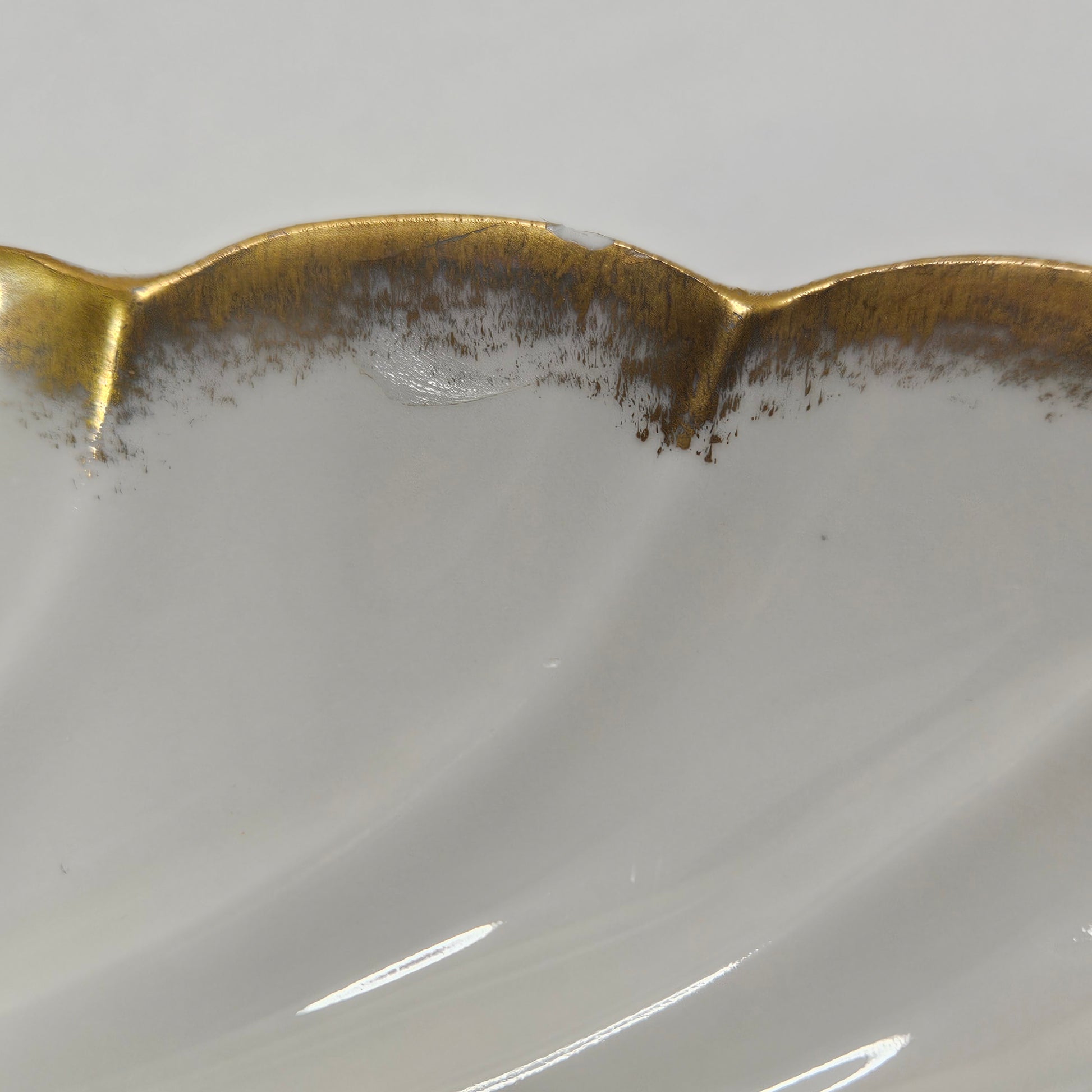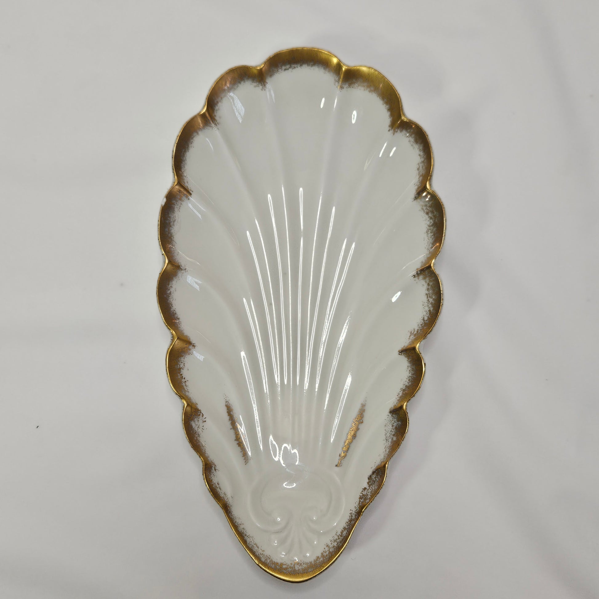 Vintage Limoges France white porcelain shell dish with gold trim. Small repair has been made - see photos for details. Dish is 8.5" x 5"