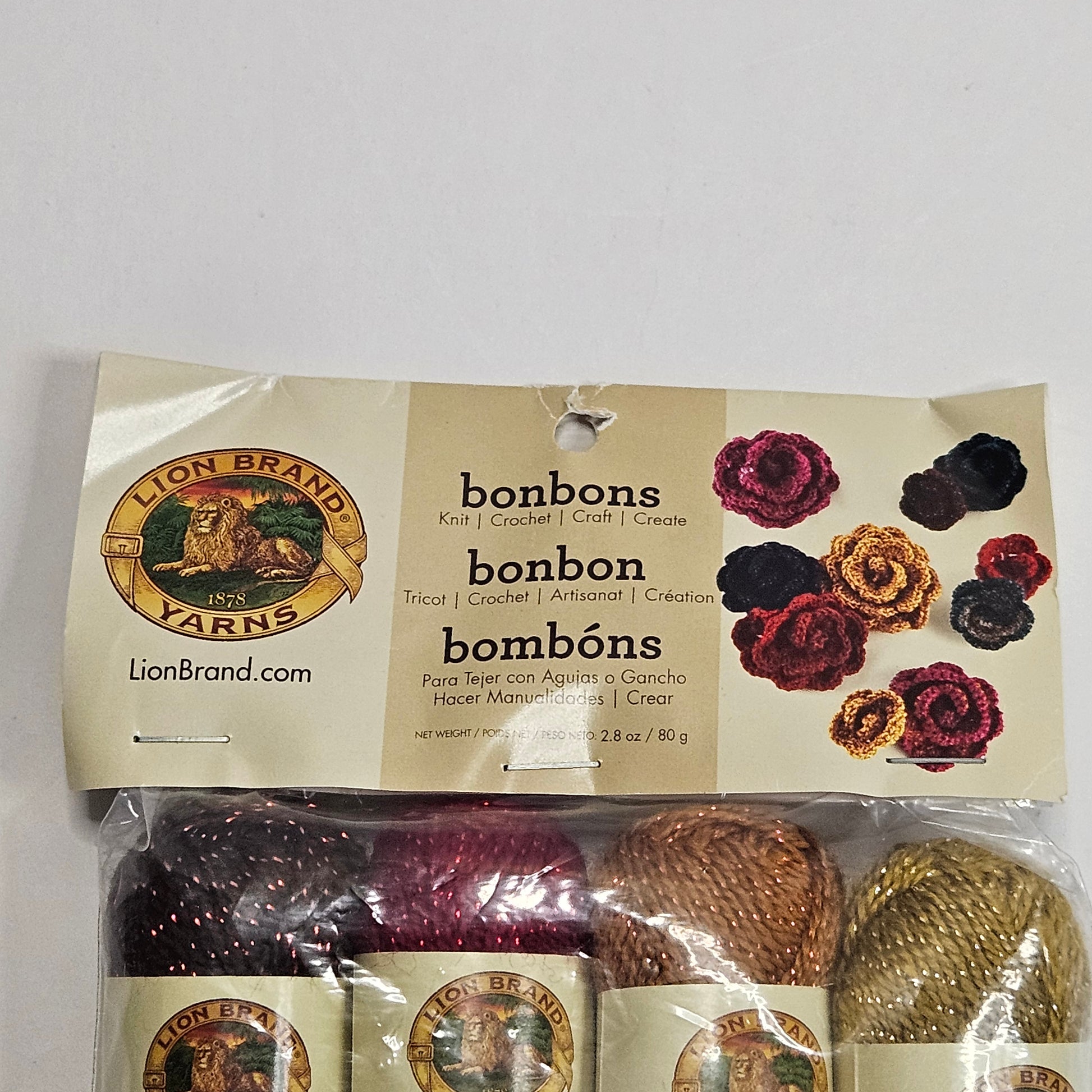 Lion Brand BonBons Party assortments is eight small, colorful skeins with 96% acryllic and 4% metallic polyester fibers. They are perfect for creative detailing and adding a pop of color to other projects.