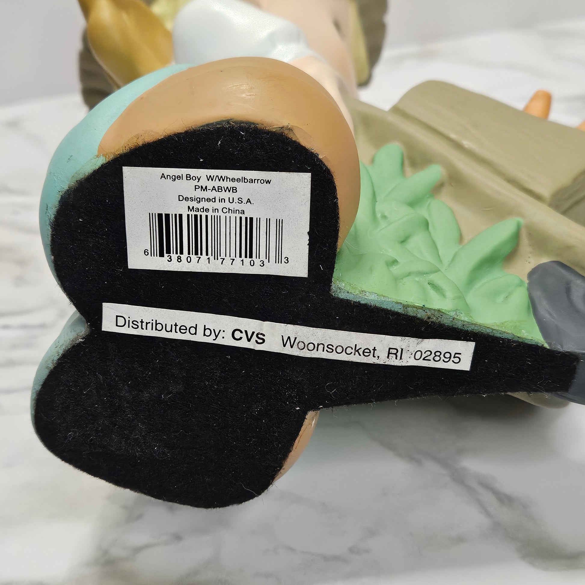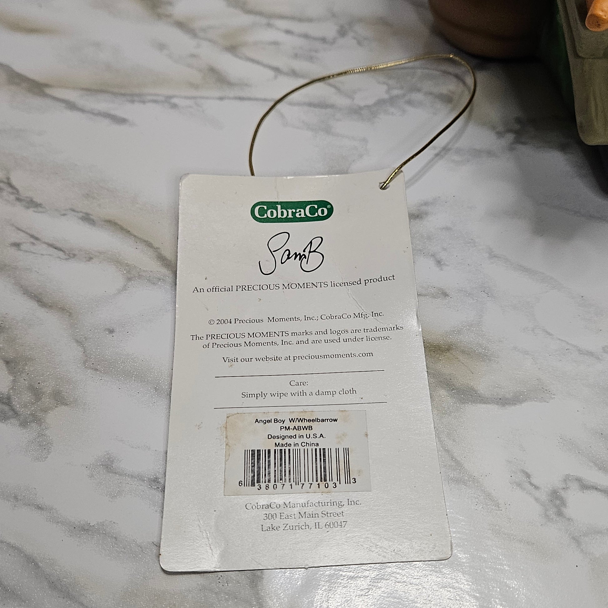 This 2004 Precious Moments Angel Boy with Wheelbarrow SamB figurine was made by CobraCo. Has original hang tag.