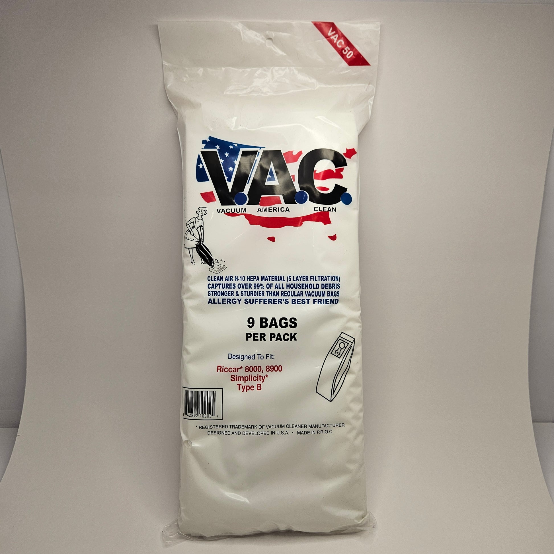 VAC HEPA Vacuum Cleaner Bags VAC-50 Riccar or Simplicity Type B NEW 9 bags in ea